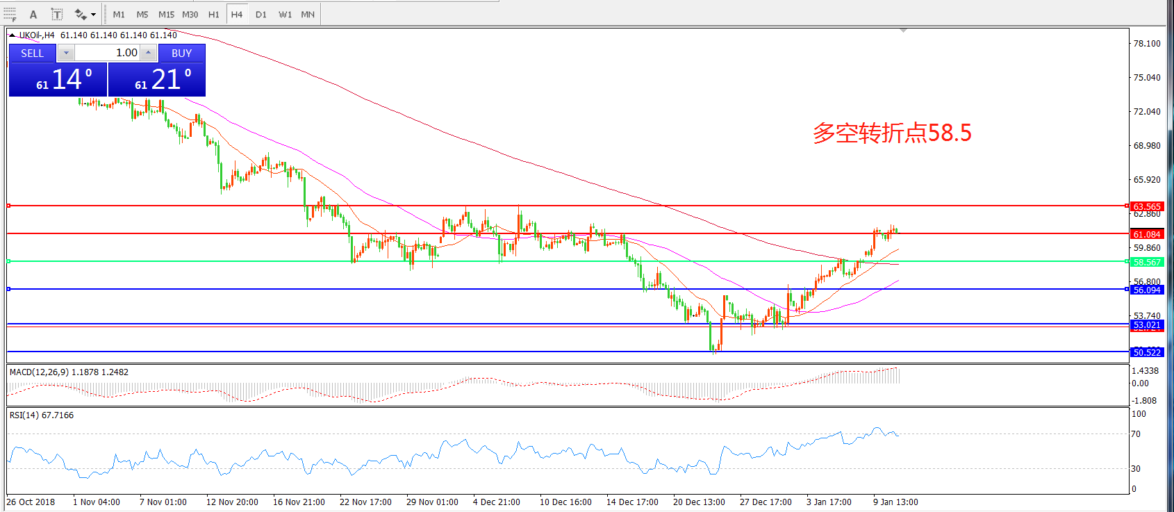 4小时图看,油价站稳58.5美金后稳步上行, 21与55均线形成金叉,MACD红柱增加,RSI指标处于超买区域拐头,短线有回落风险,但整体走势偏多。