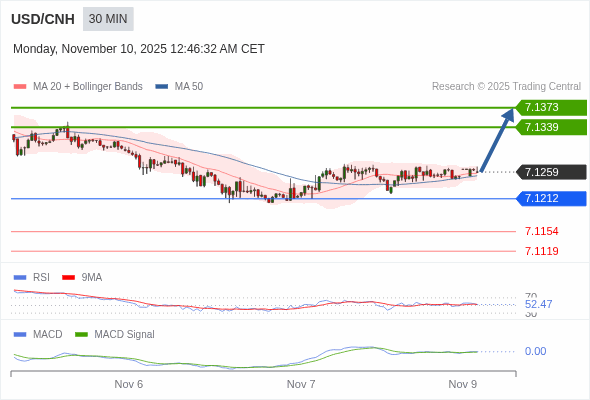 美元/人民币 当日内 : 看涨,当 7.1212 为支撑位。