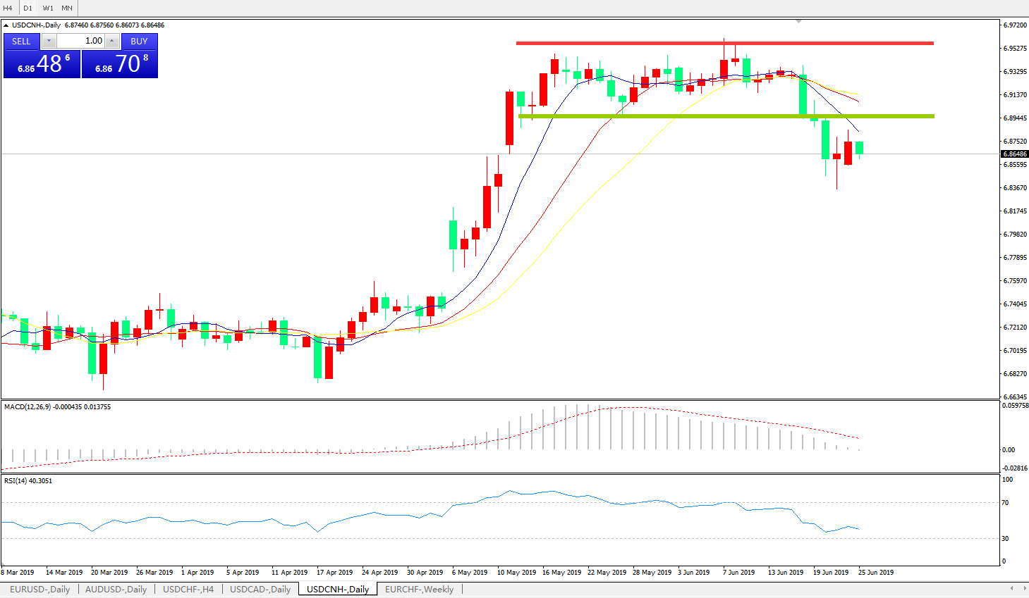 技术面简析:日线呈有序空头排列MACD逼近0轴且动能柱绿柱显现RSI逐步走低,在贸易争端缓解及G20乐观预期推动下,汇价大概率将进一步走低