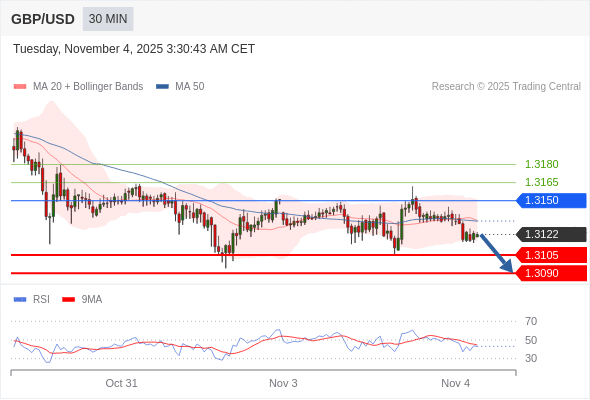 在 1.3150 之下,看跌,目标价位为 1.3105 ,然后为 1.3090 。