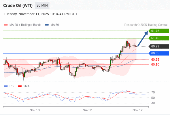 在 60.65 之上,看涨,目标价位为 61.40 ,然后为 61.75 。