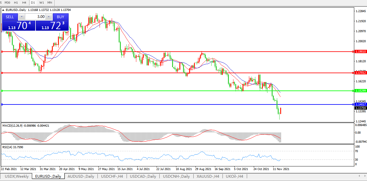 技术面简析:日图均线呈空头排列,汇价大跌后连续上攻,MACD运行于0轴下且量能放量,RSI有止跌迹象 ,预计短期汇价大概率将在反弹后进一步下行。