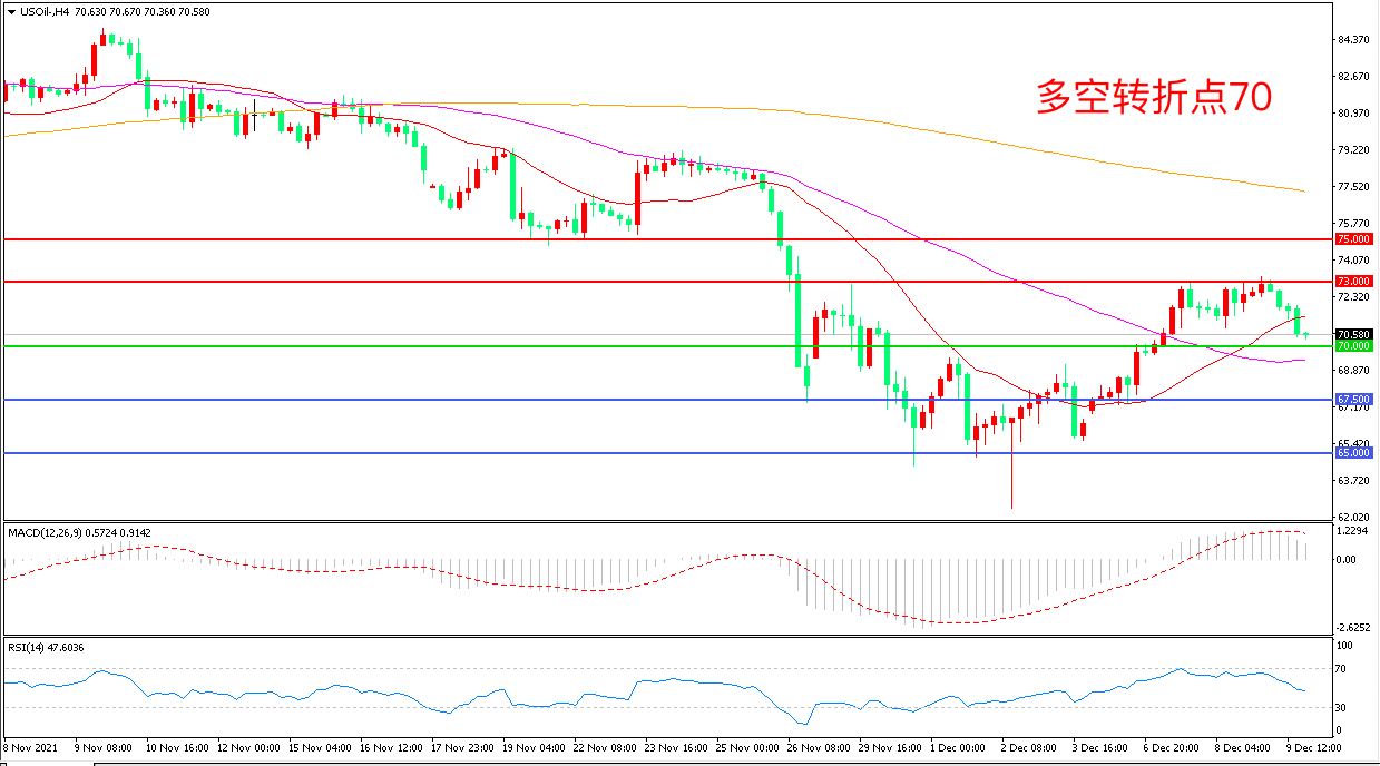 周四(12月9日),虽然目前数据显示奥密克戎病毒致死率较低,但市场兴奋情绪逐步消退,风险资产整体回落,美国WTI原油承压回落,收报72.54美元/桶。油价没能再进一步表明多头对当前的市场信心不足,疫情的干扰以及美联储加息的预期下,油价想要突破仍需更多助力。