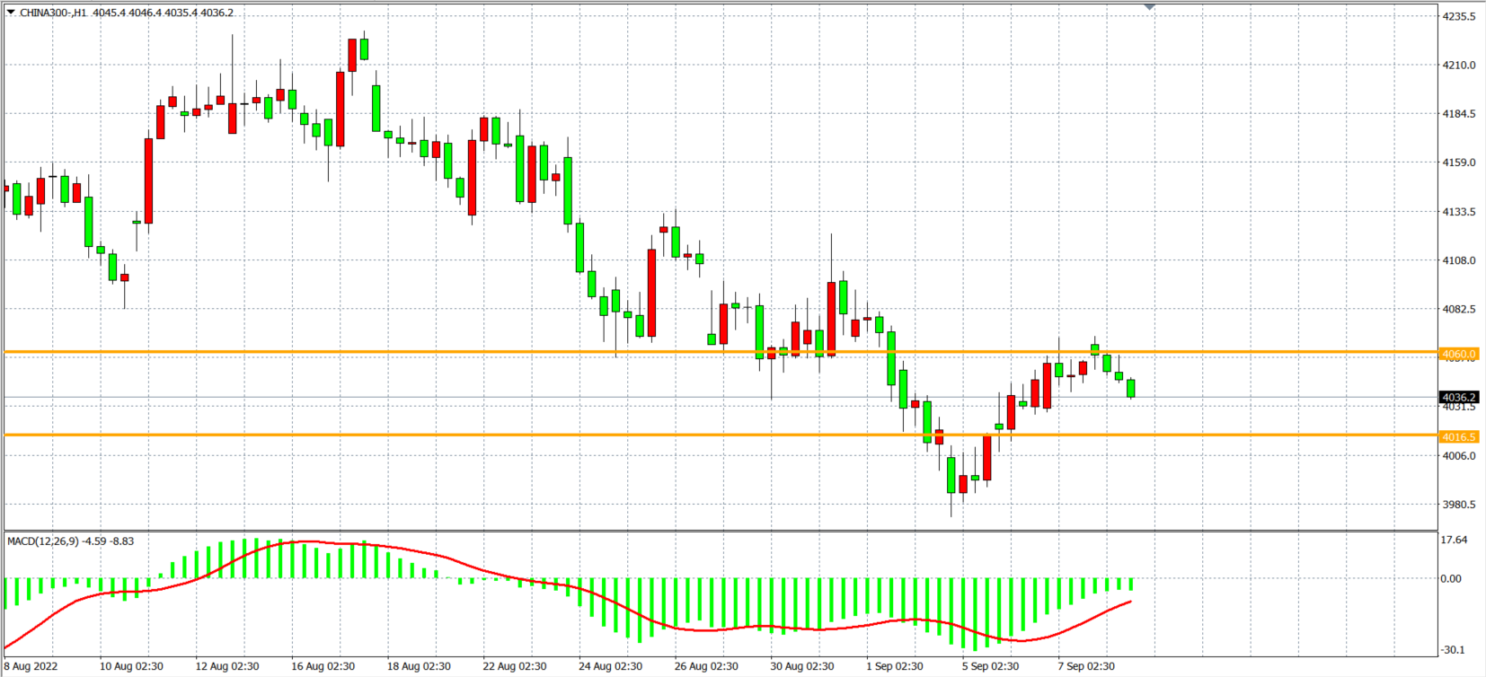 1小时图看,沪深300反弹受阻,阻力位4060的压制明显,MACD于零轴之下量能持续缩小,显示行情或进入选择方向,目前短线支撑依旧看4016,上方阻力看4060,日内或走区间震荡为主