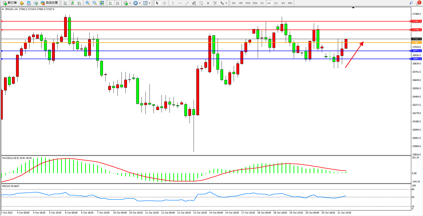 日经225指数10月21日(周五)收盘下跌120.46点,跌幅0.45%,报26886.50点。日本工会总联合会消息称,将在2023年春季劳资谈判中,把加薪要求定为5%左右,这一幅度是统一上调基本工资的“Base—Up”和定期加薪的合计比例。