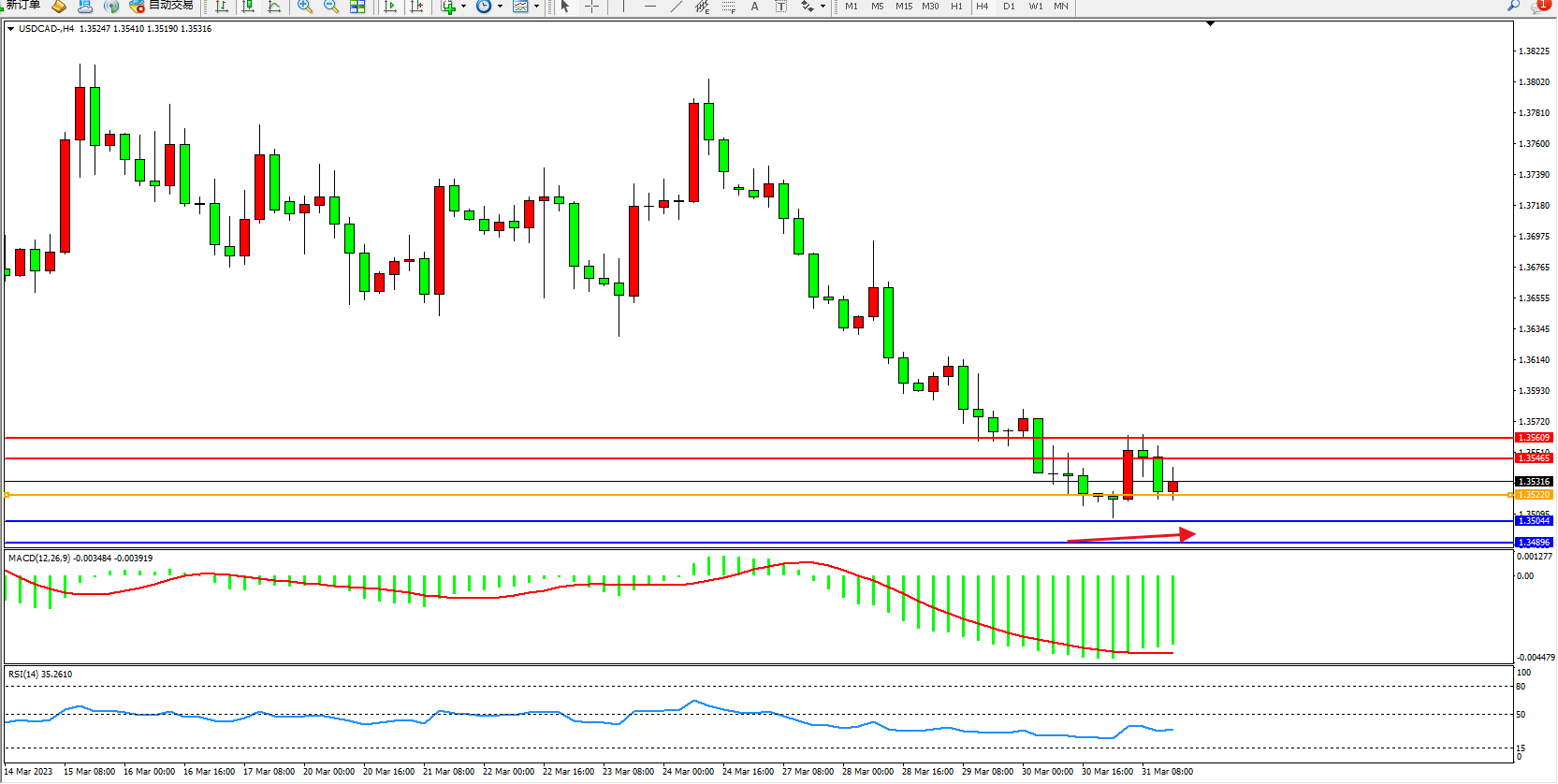 4小时图看:空头动力持续震荡下挫,低位短期维持整理,多头动力有伺机入场迹象,MACD指标处于空头区域低位整理,RSI指标处于空头区域维持徘徊;