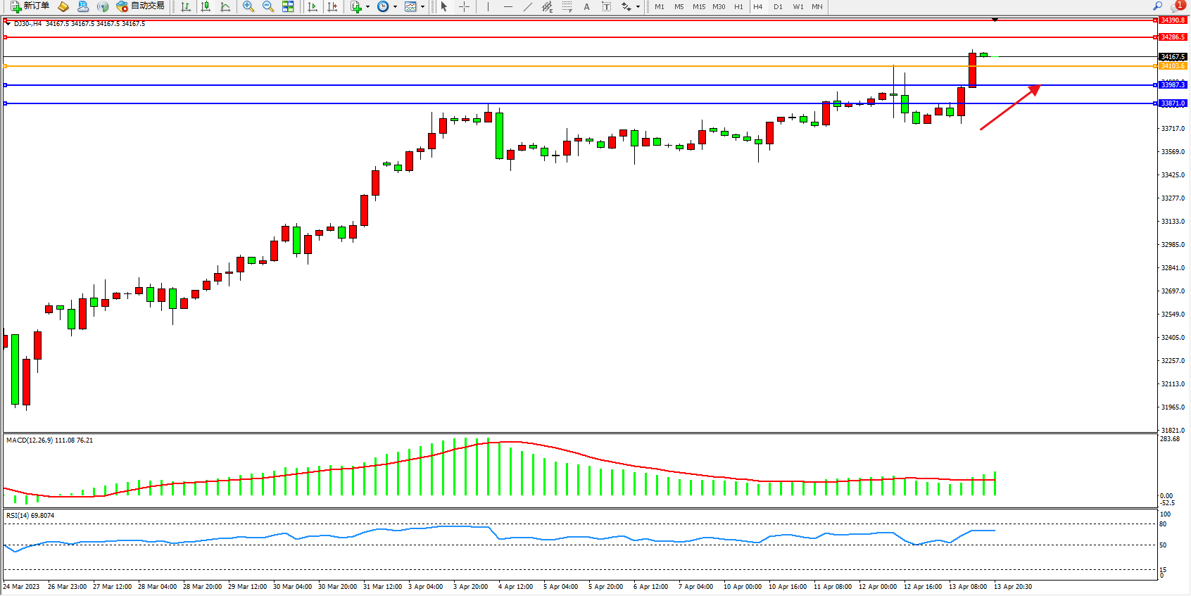 道琼斯指数4月13日(周四)收盘上涨383.84点,涨幅1.14%,报34030.34点;美国初请失业金人数三周以来首次上升,这表明仍然强劲的劳动力市场出现了一些疲软。续请失业救济的人数表明人们在失业后很难找到工作。