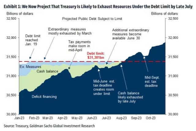 高盛首席经济学家兼全球投资研究主管Jan Hatzius在最新的报告中指出,4月美国政府税收不及预期或使债务上限危机从7月提前至6月,金融市场将加大对债务上限风险的押注: