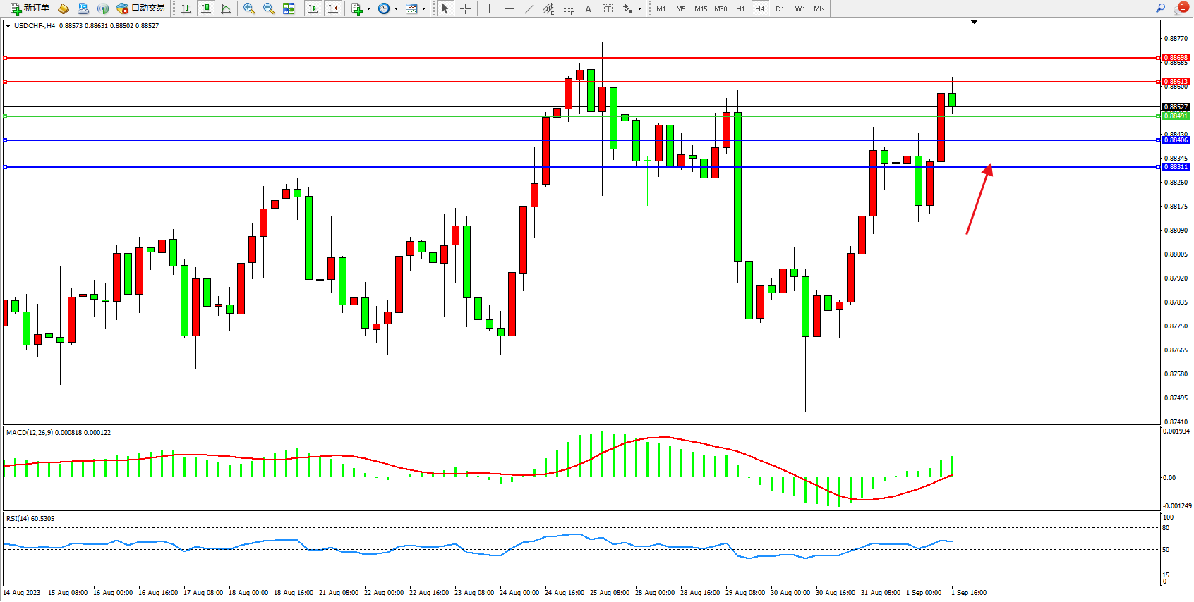 美元兑瑞郎维持0.88527附近震荡,瑞士8月总体通胀率意外保持在1.6%,而预期为降至1.5%。同时,核心CPI同比涨幅从1.7%降至1.5%。瑞士央行将于9月21日宣布其最新政策决定。目前,市场预计其将暂停加息,目前消化的加息25个基点的概率为35%。